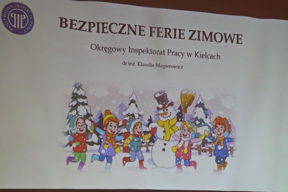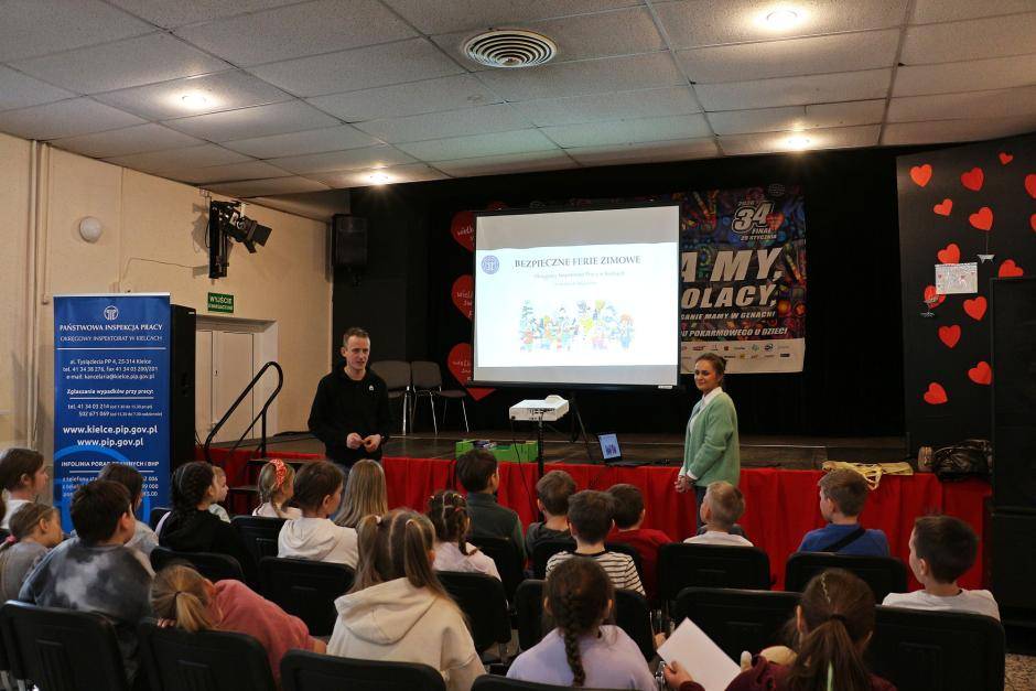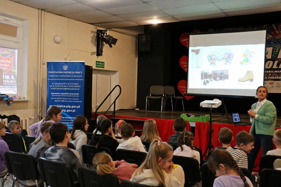 W dniu 22 stycznia 2026 r. nasz pracownik przeprowadził szkolenie dla dzieci - uczestników półkolonii w Domu Kultury w Małogoszczu pn. "Bezpieczne ferie zimowe". Dzieci aktywnie uczestniczyły w spotkaniu, w którym poznały i utrwaliły wiedzę na temat bezpiecznych zabaw zimowych. Chętnie odpowiadały na zagadki i pytania prowadzącej, a po zakończonych wykładach wszystkie otrzymały wydawnictwa i gadżety Inspekcji Pracy.