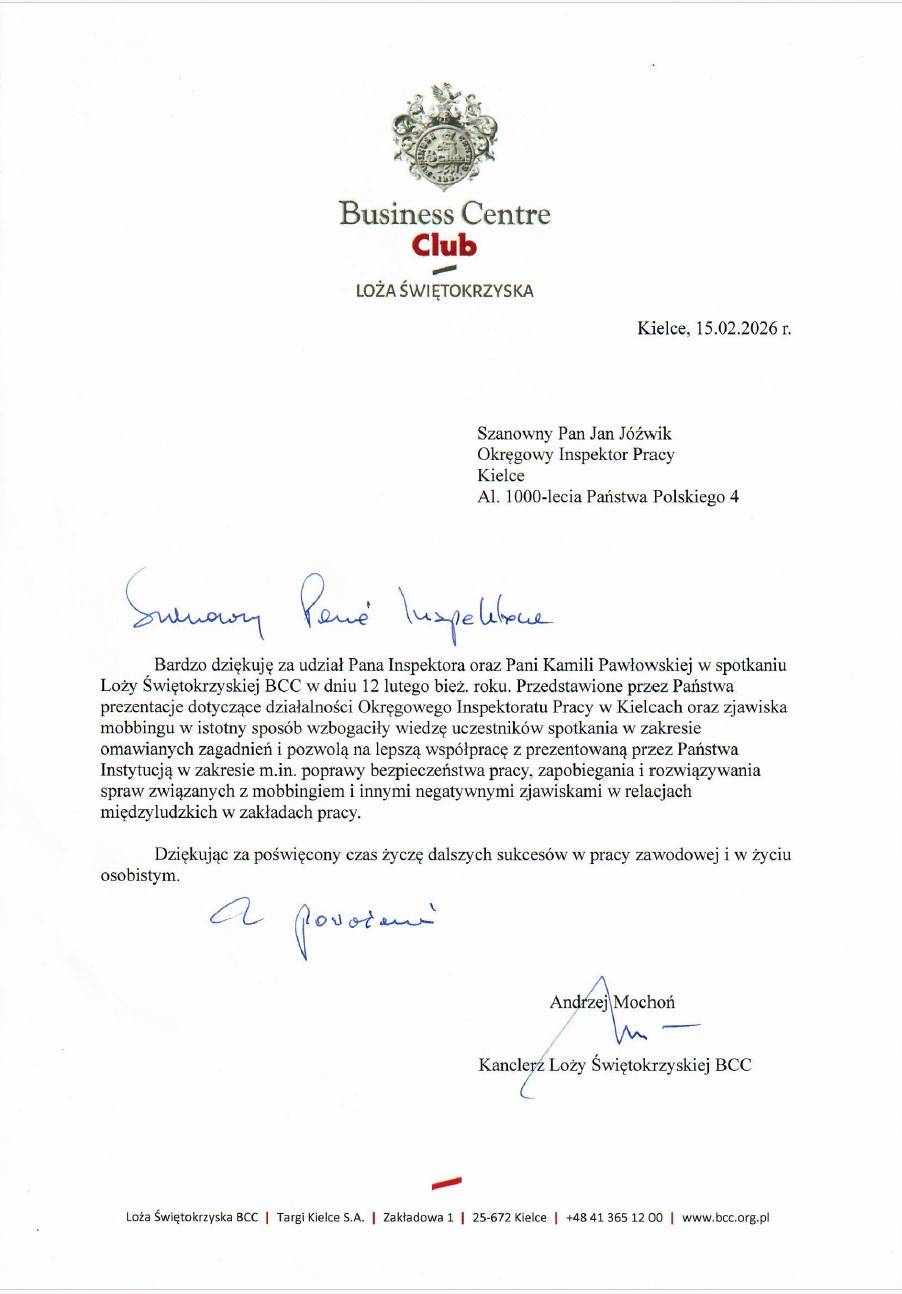 12 lutego w sali konferencyjnej hotelu „Echo” w Cedzynie odbyło się spotkanie członków Loży Świętokrzyskiej Business Center Club pod hasłem „Bezpieczne granice w relacjach zawodowych – jak rozpoznać mobbing w miejscu pracy”. W wydarzeniu wzięli udział okręgowy inspektor pracy Jan Jóźwik oraz Kamila Pawłowska – starszy inspektor pracy, rzecznik prasowy Okręgowego Inspektoratu Pracy w Kielcach.