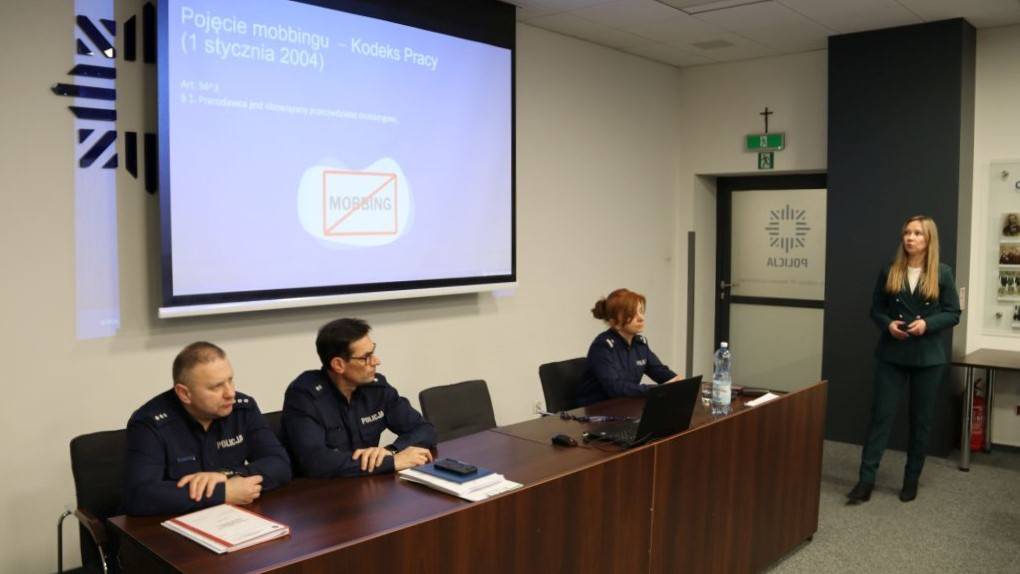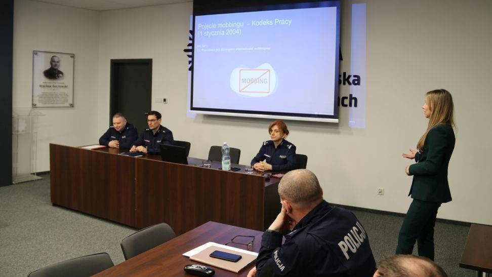 19 lutego w Komendzie Miejskiej Policji w Kielcach odbyło się szkolenie z zakresu przeciwdziałania mobbingowi w miejscu pracy. Szkolenie przeprowadziła Kamila Pawłowska , starszy inspektor pracy Okręgowego Inspektoratu Pracy w Kielcach, która omówiła zagadnienia związane z rozpoznawaniem oraz przeciwdziałaniem zjawisku mobbingu, a także zagrożeniami psychospołecznymi w środowisku pracy. Prelegentka zwróciła uwagę, jak istotne jest budowanie jak najwyższej świadomości w zakresie zagrożeń psychospołecznych w każdym miejscu pracy oraz tworzenie bezpiecznych, opartych na wzajemnym szacunku relacji zawodowych.