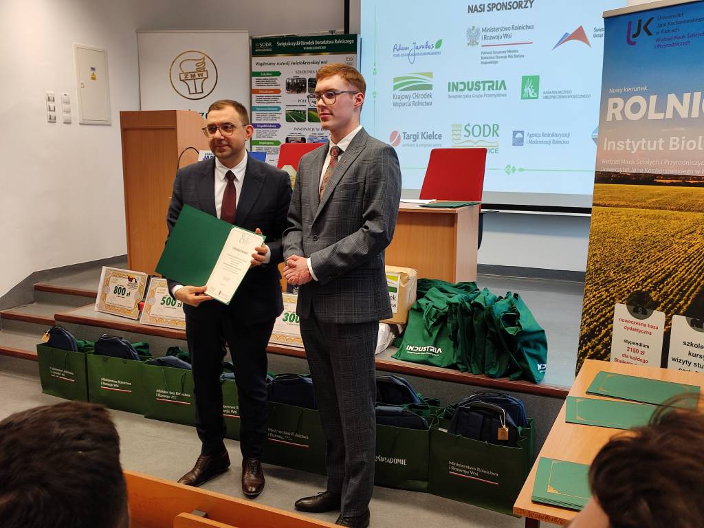 III miejsce zdobył Filip Życiński z Zespołu Szkół Centrum Kształcenia Rolniczego w Sandomierzu - nagrodę wręczył Jan Jóźwik Okręgowy Inspektor Pracy, gratulując laureatowi wiedzy, zaangażowania i pasji do rolnictwa.