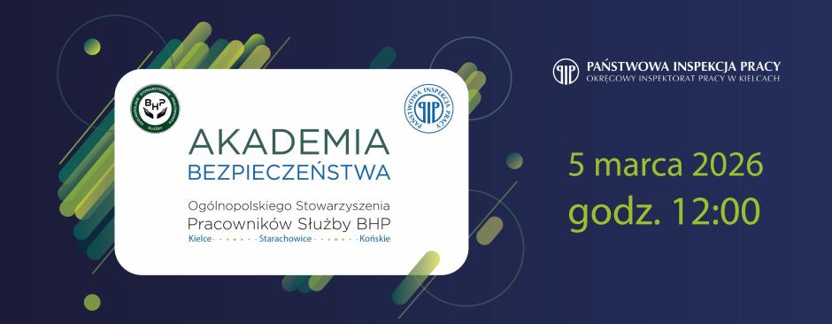 5 marca 2026 r. o godz. 12.00 w siedzibie Okręgowego Inspektoratu Pracy w Kielcach odbędzie się kolejne szkolenie w ramach Akademii Bezpieczeństwa dla członków Ogólnopolskiego Stowarzyszenia Pracowników Służb BHP Oddział Kielce, Starachowice, Końskie.